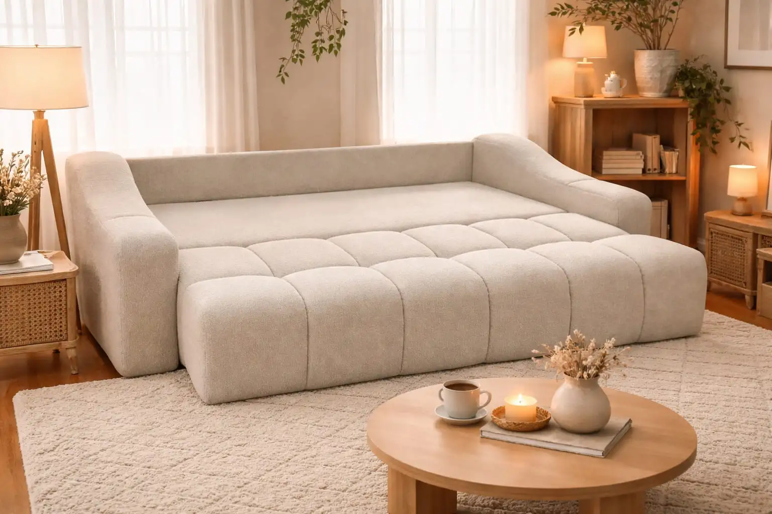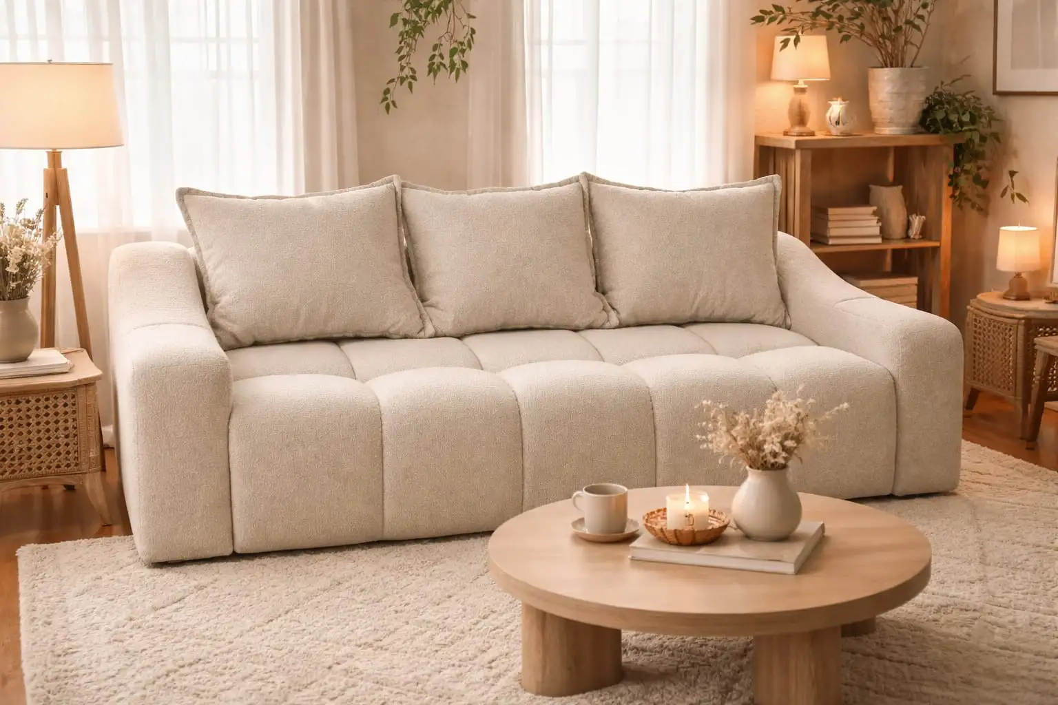 Lada de depozitare integrată sub șezut facilitează organizarea lenjeriilor, a pernelor sau a accesoriilor, menținând livingul ordonat.