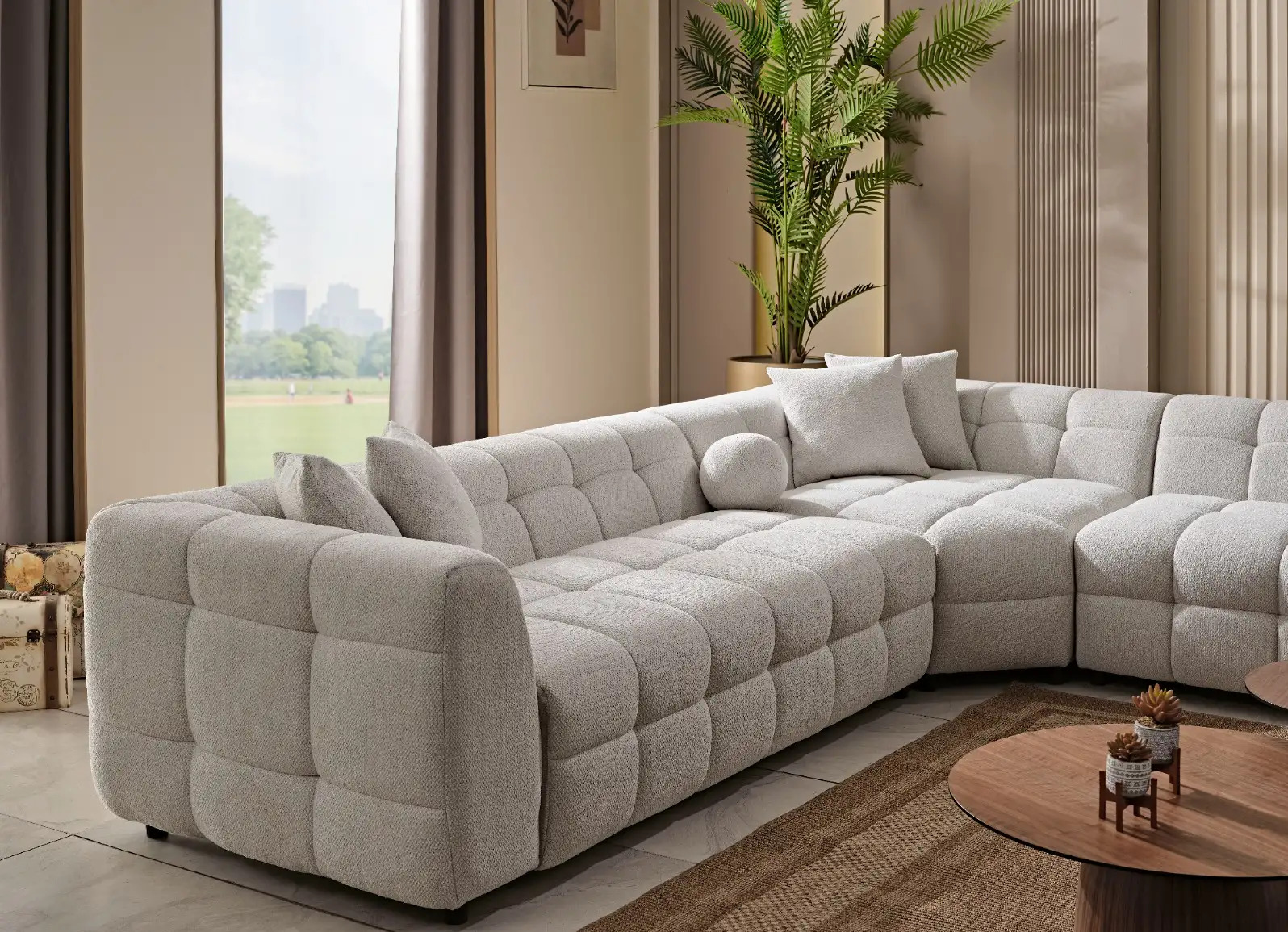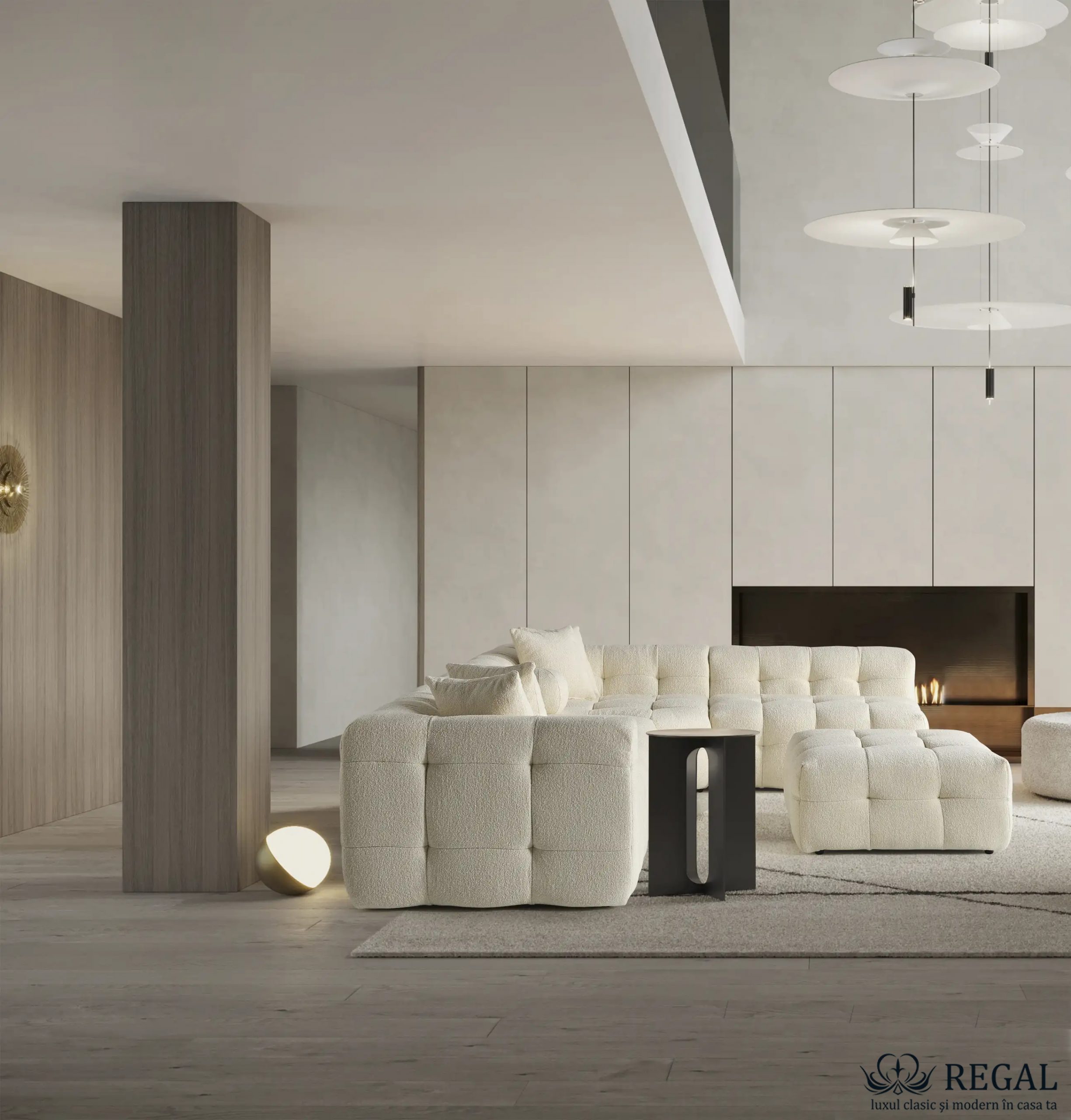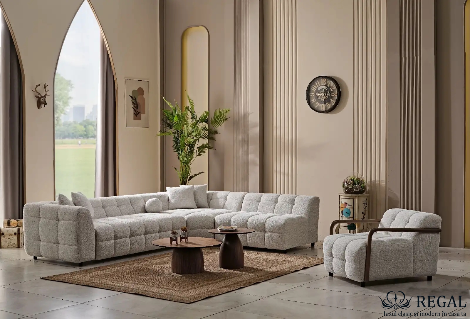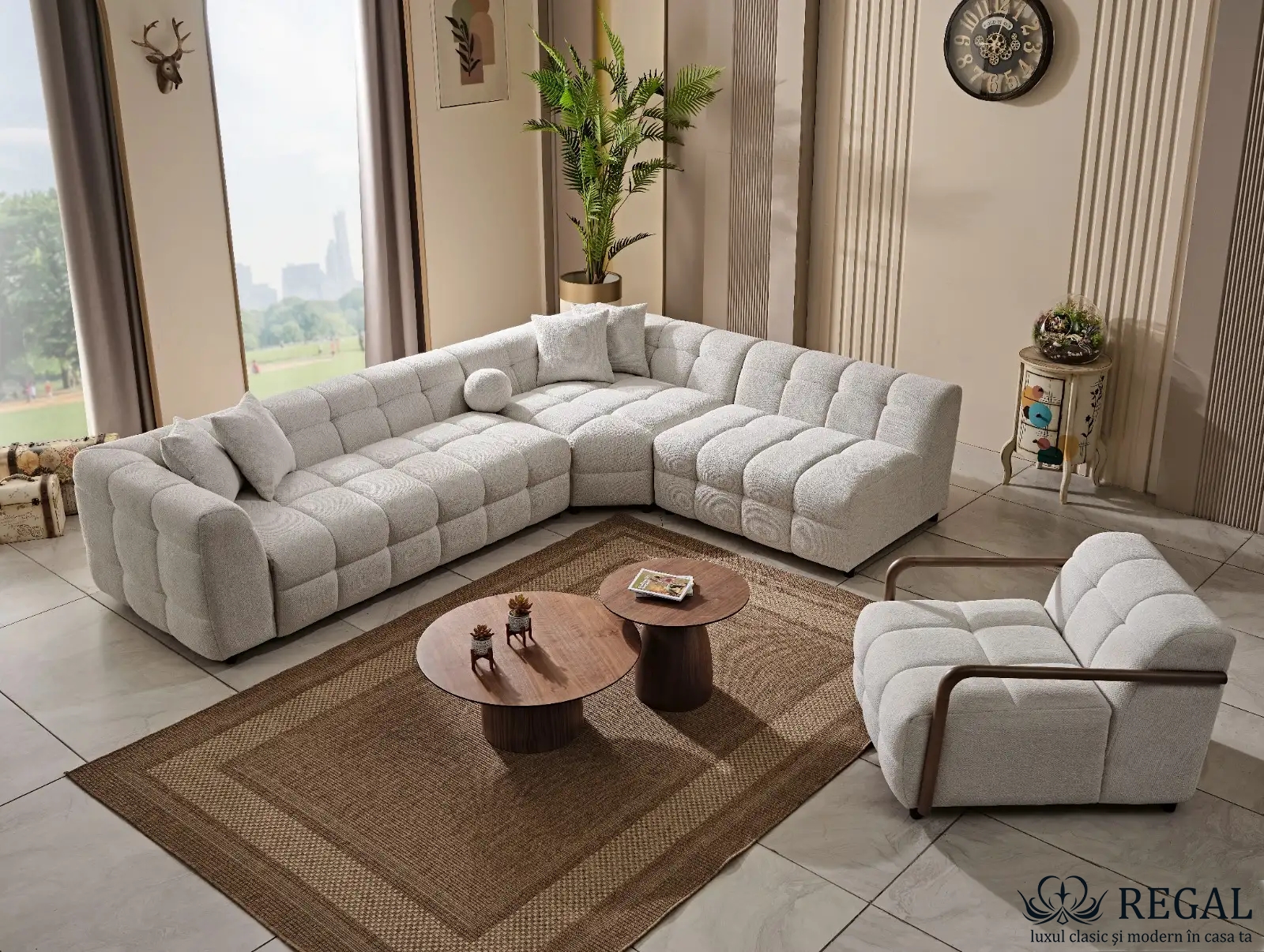 Coltarul modular Toronto este cea mai bună alegere pentru cei care caută atât eleganța cât și confortul datorita sistemului pe arcuri ondulate(wave) combinate cu mai multe straturi din spuma poliuretanica,cadrul din lemn de fag,stofa calitate Premium Boucle.