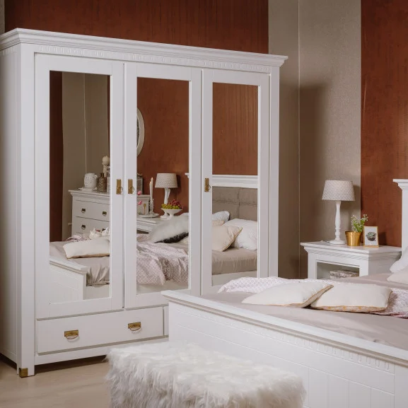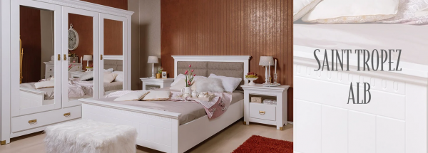 Îți oferim un set de mobilă pentru dormitor care umple camera de odihnă cu un alb foarte liniștitor și cu tihnă.