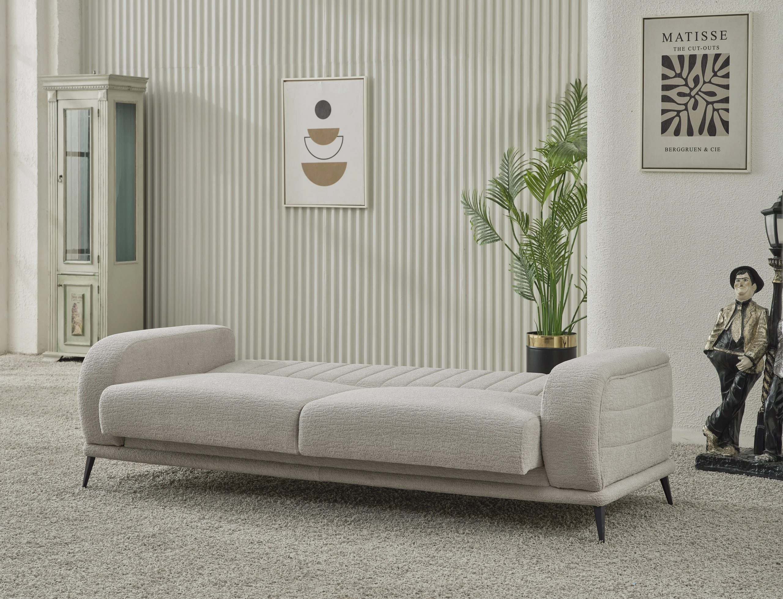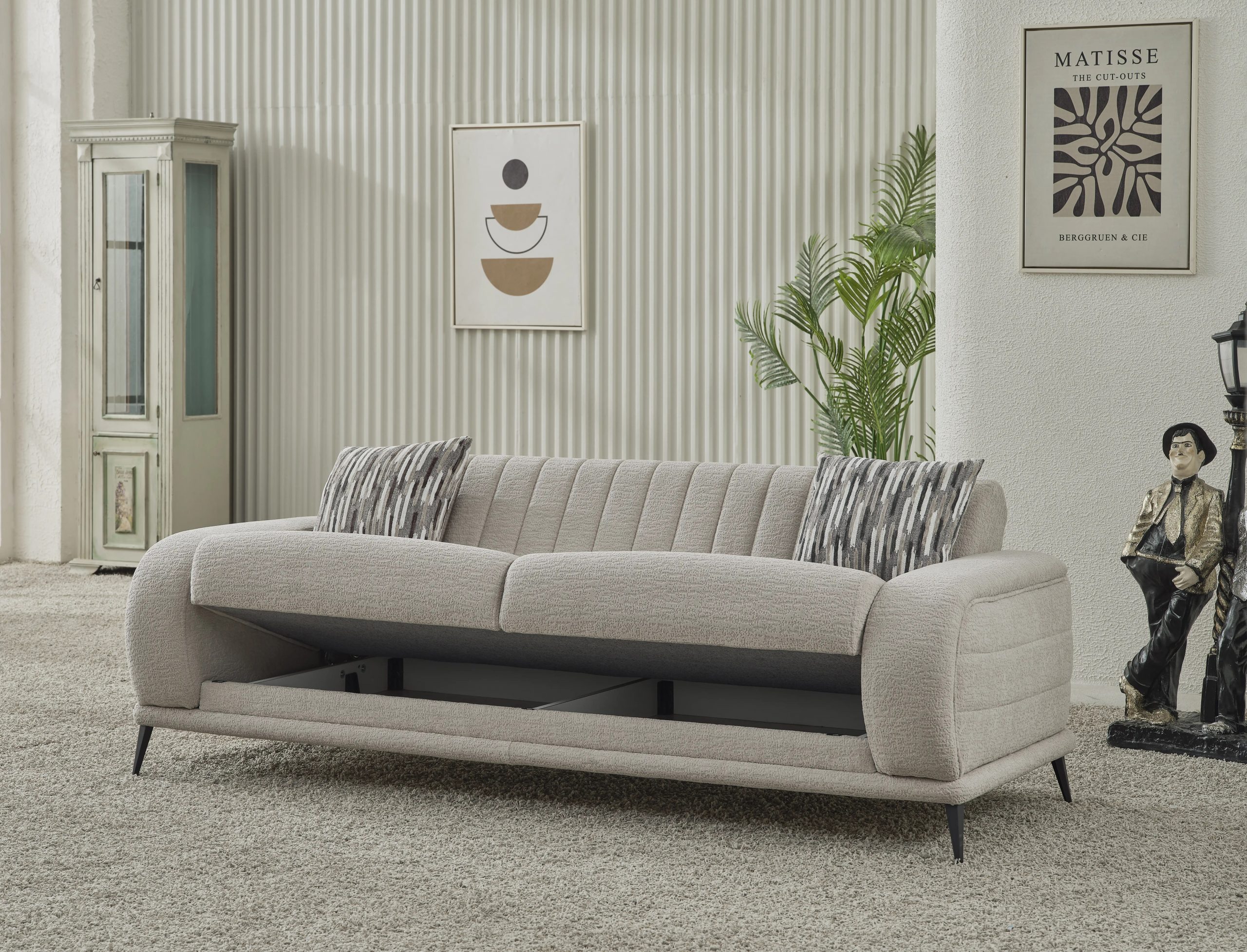 În plus, canapeaua este dotată cu o ladă de depozitare ingenios integrată, care îți permite să păstrezi lenjeria și pernele la îndemână, contribuind la un living ordonat și aerisit.