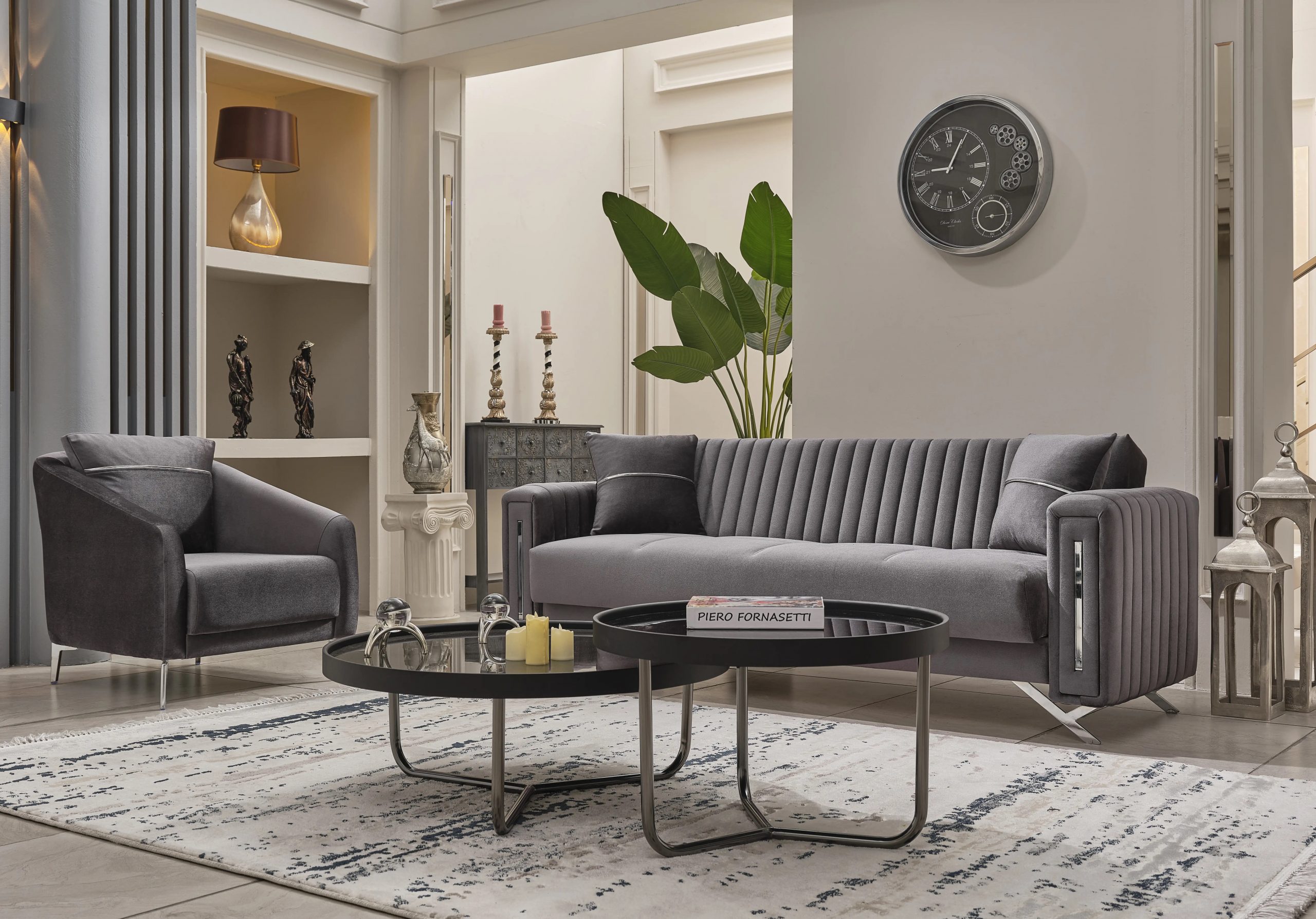 Setul modern Semfoni incântă prin eleganța și funcționalitatea sa si adaugă o notă de lux în living. Canapeaua moderna Semfoni este caracterizata de deisgnul bratelor, al spatarului si al ornamentului auriu, care invaluie bratele acesteia.