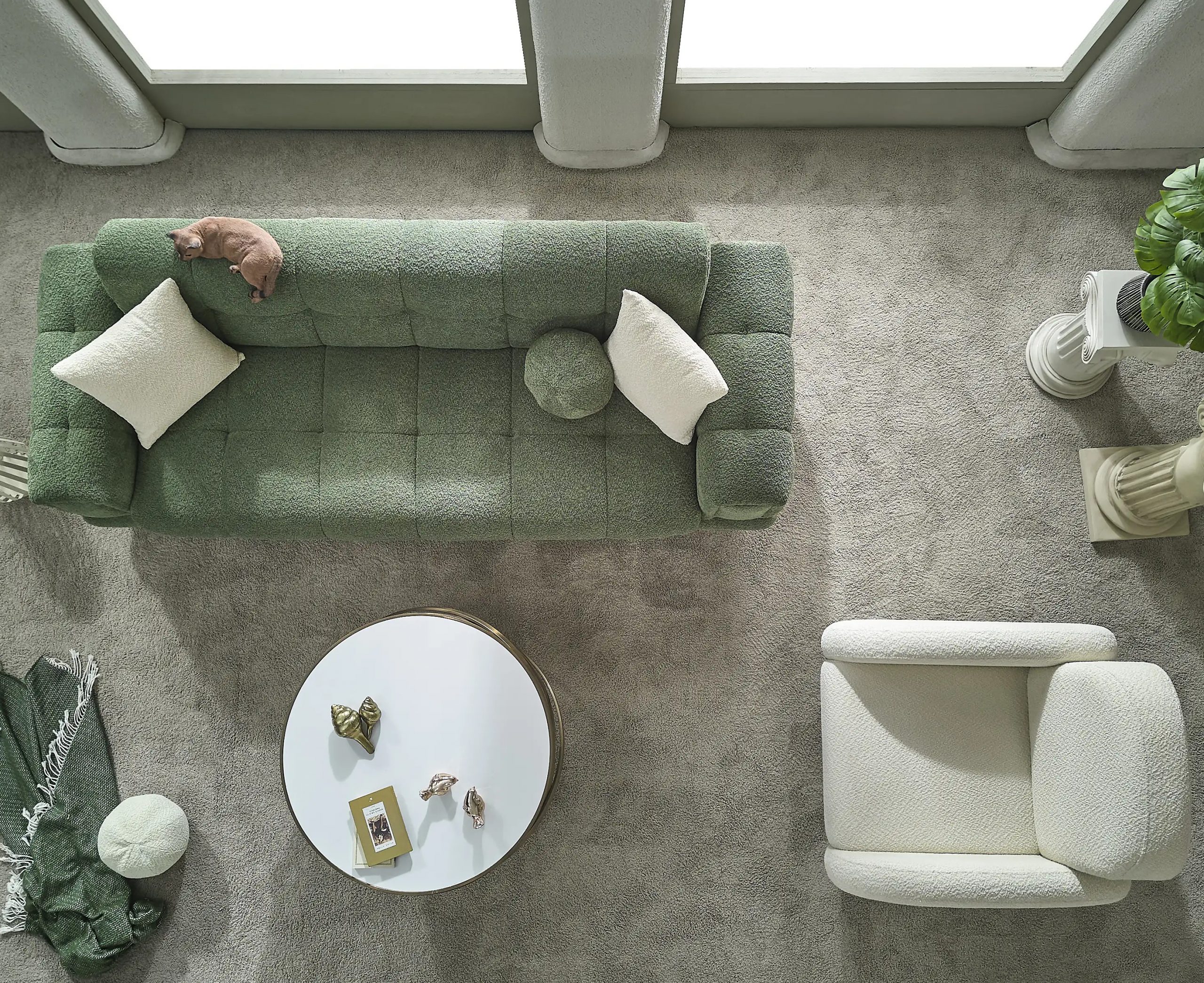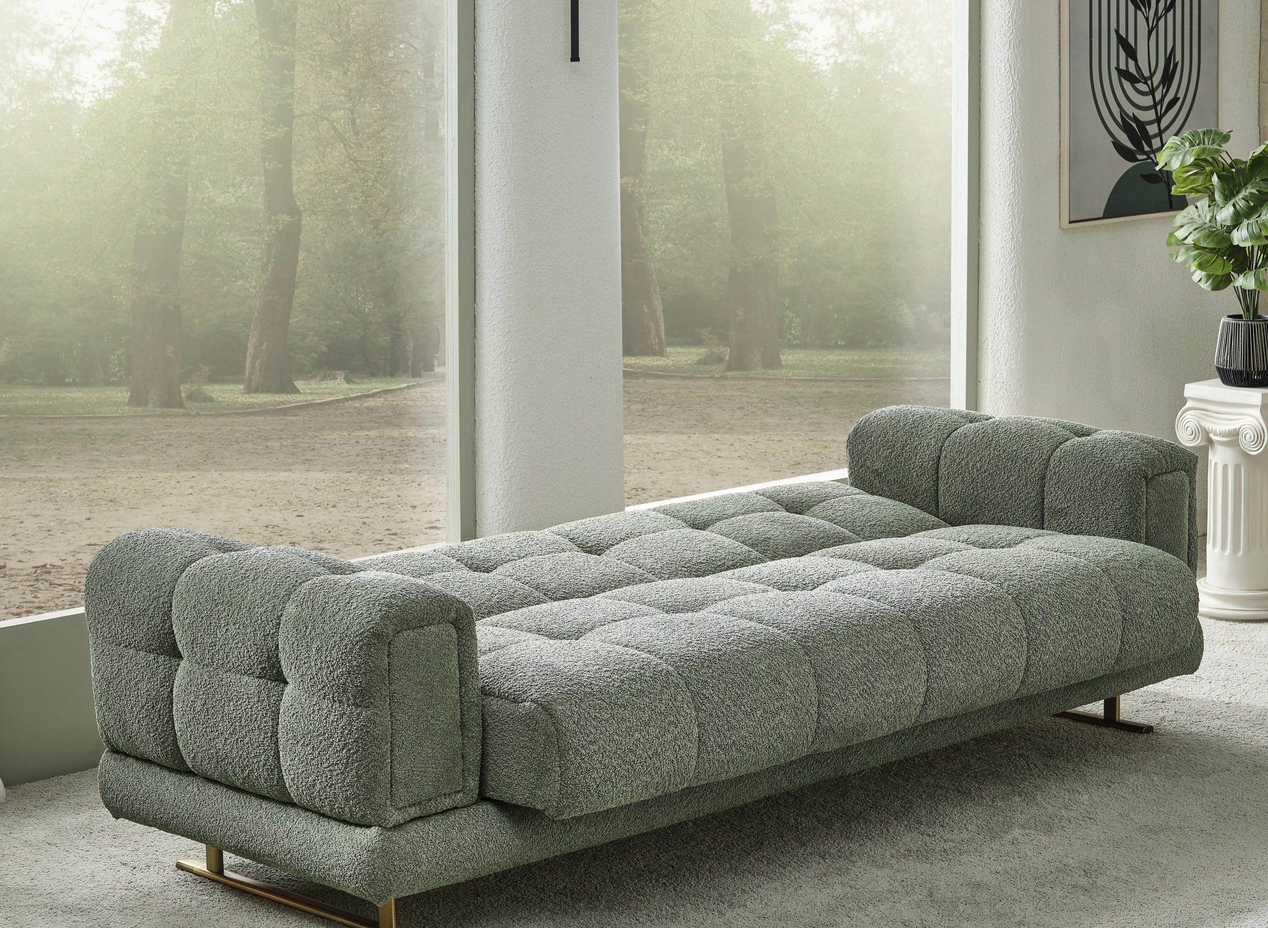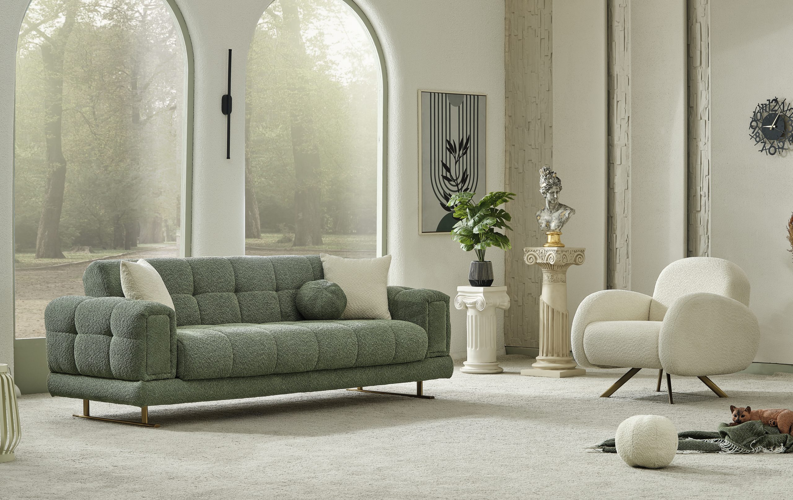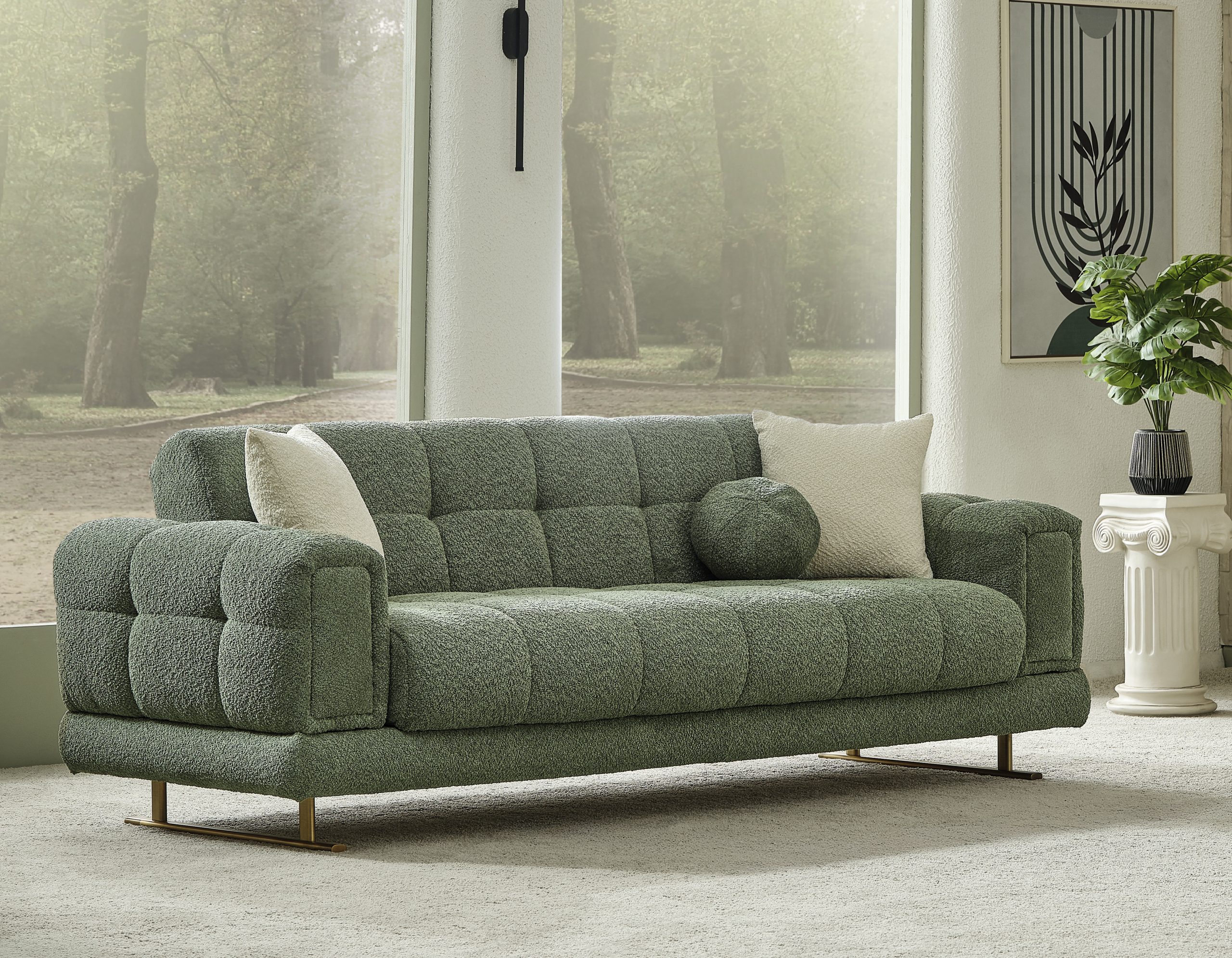 Canapeaua Canyon se remarcă prin bratele patrate mari ,cu butoni si tapițeria premium Boucle, care aduce un aer de distincție decorului tău. Pernele decorative, cu patternuri complementare, contribuie la un dinamism vizual, transformând canapeaua într-un element central al camerei. Materialele de înaltă calitate asigură un confort excelent, făcând din această canapea alegerea perfectă pentru momentele de relaxare, fie că vrei să te bucuri de o lectură plăcută, fie că îți dorești un somn odihnitor.