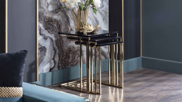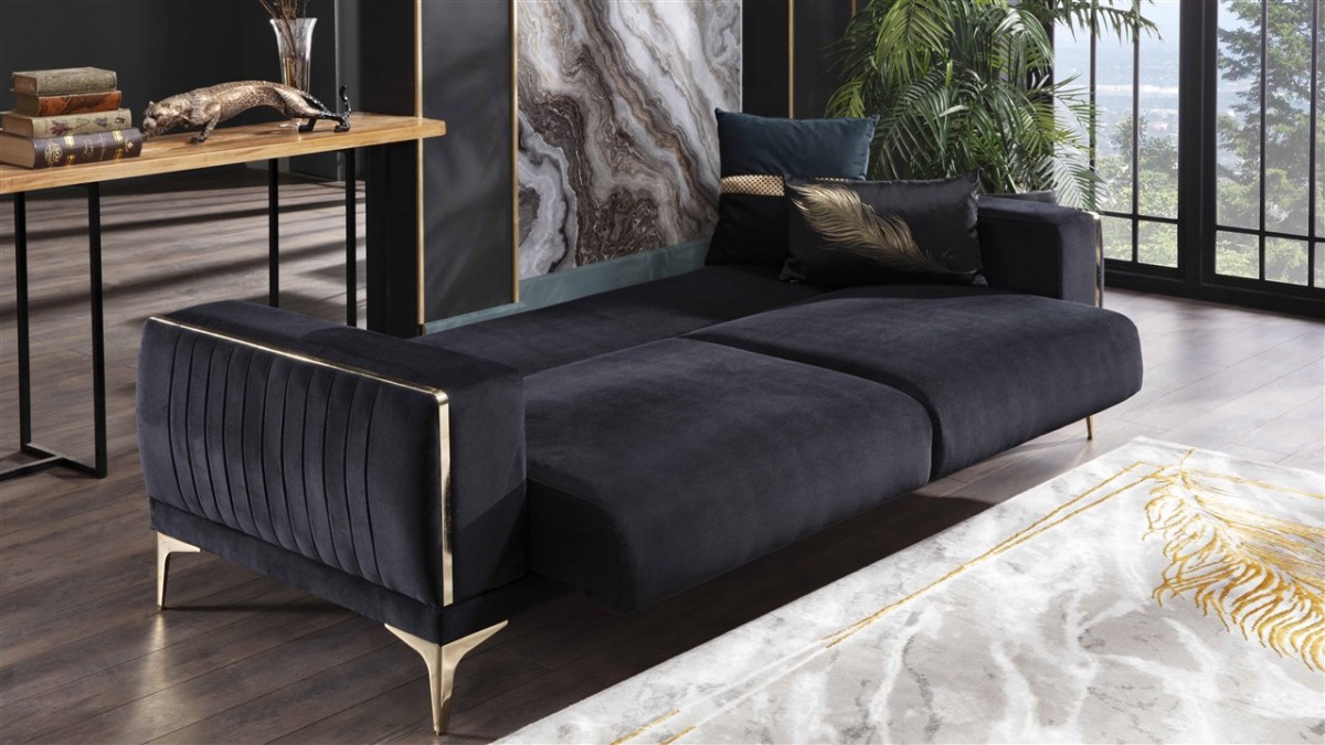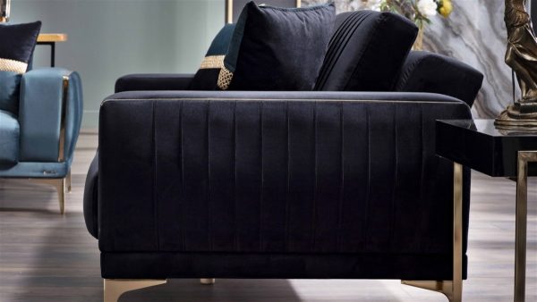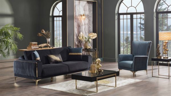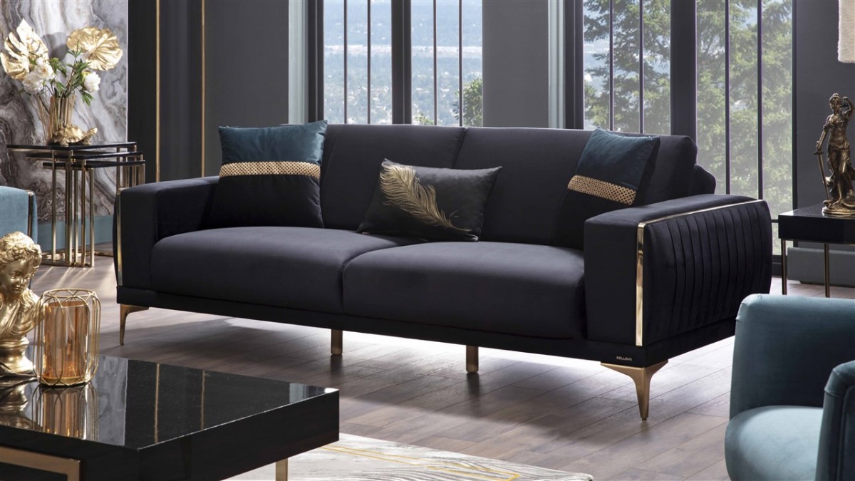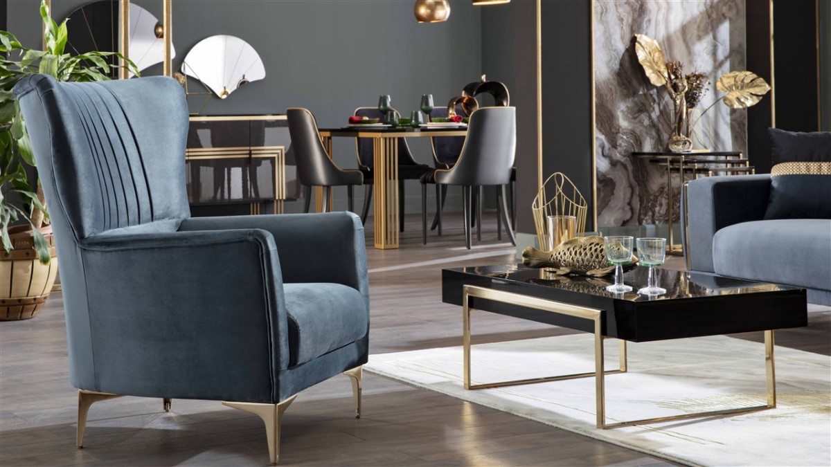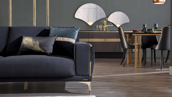 Metalul de culoare aurie aplicat în detaliul pe brat, susține armonia conceptului în setul Carlino.